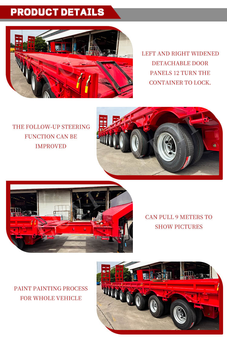 Udstyret med et 10-akslet forstærket design og parret med luft- eller bladfjederaffjedring, leverer traileren enestående kørestabilitet. Den faste svanehalsstruktur sikrer pålidelig trækkraft, mens den hydrauliske eller manuelle stige letter lastning og losning. Den leveres som standard med 28-tons landingsstel for stabil og holdbar støtte, og farven kan tilpasses efter behov. Med sit fremragende strukturelle design og strenge kvalitetskontrol er den velegnet til transport af tung last såsom stort udstyr og tekniske komponenter, hvilket giver en effektiv og sikker løsning til logistik- og transportindustrien.