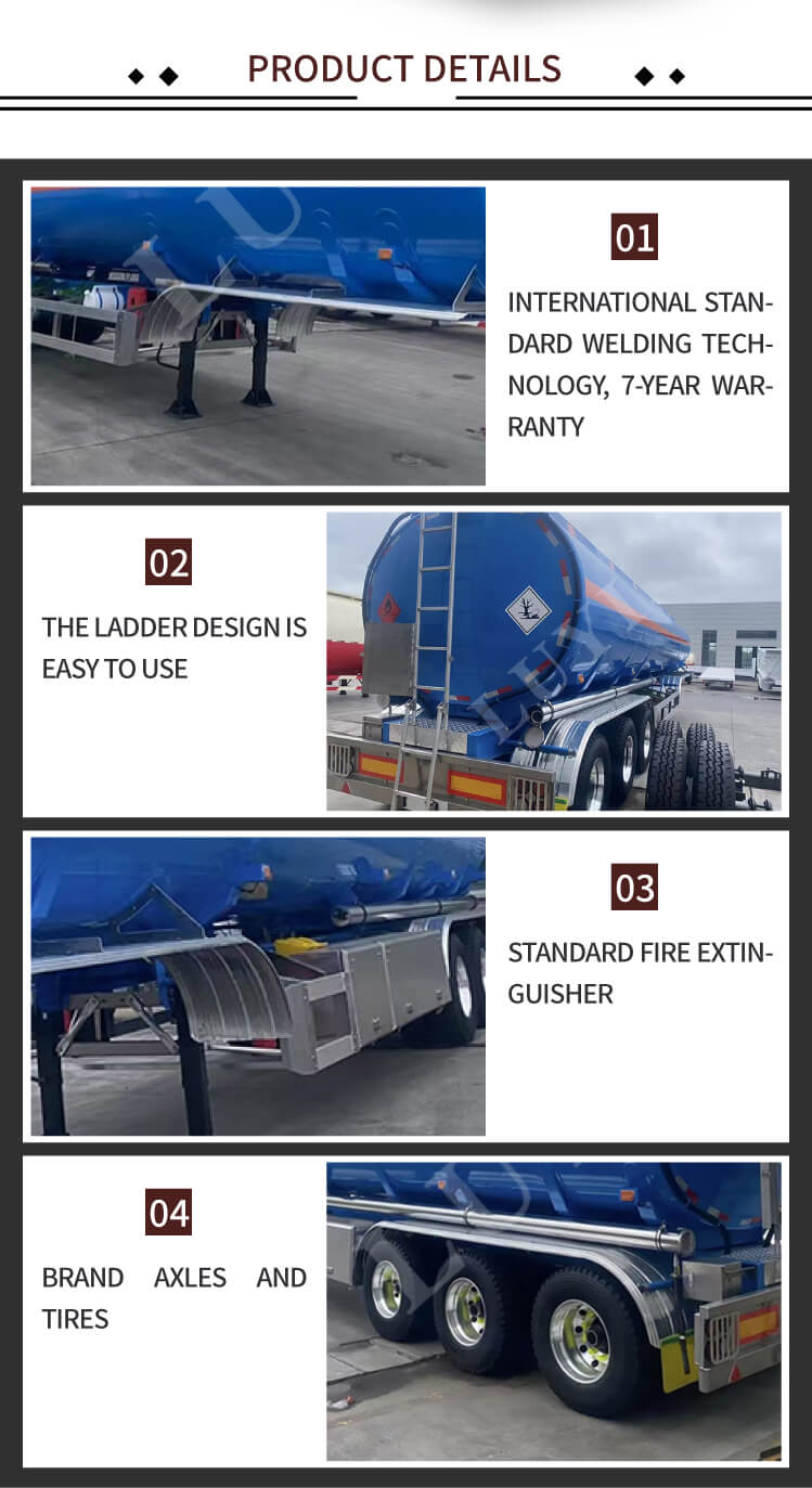 Med dimensioner på 12500×2500×3600 mm fås tankkroppen i kulstofstål eller aluminiumslegering, hvilket balancerer holdbarhed og letvægtsydelse. Udstyret med 3 aksler tilbyder den muligheder fra velkendte mærker som CIMC, ZF, FUWA og BPW, parret med mekanisk affjedring for at sikre kørestabilitet. Nøglekomponenter har fremragende kvalitet: Støttebenene anvender JOST standard 28-tons kvalitet, kingpin har valgfri JOST-modeller på 2 tommer (50 mm) eller 3,5 tommer (90 mm), og dækkene har tre specifikationer, herunder 12R22.5. 90×13×10-lags bladfjeder forbedrer bæreevnen yderligere. Farven kan tilpasses efter kundernes behov, hvilket gør den til et pålideligt valg inden for brændstoftransport.