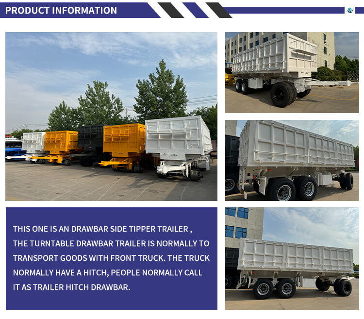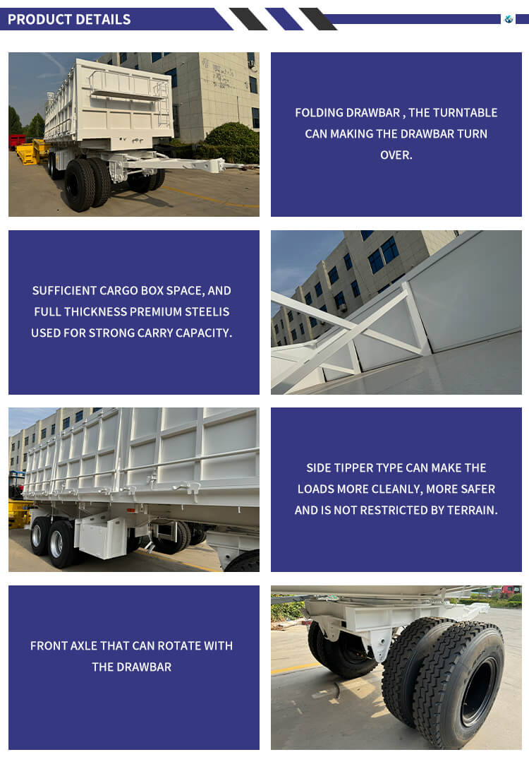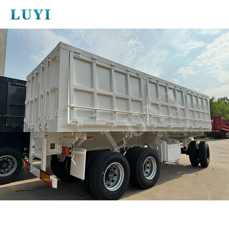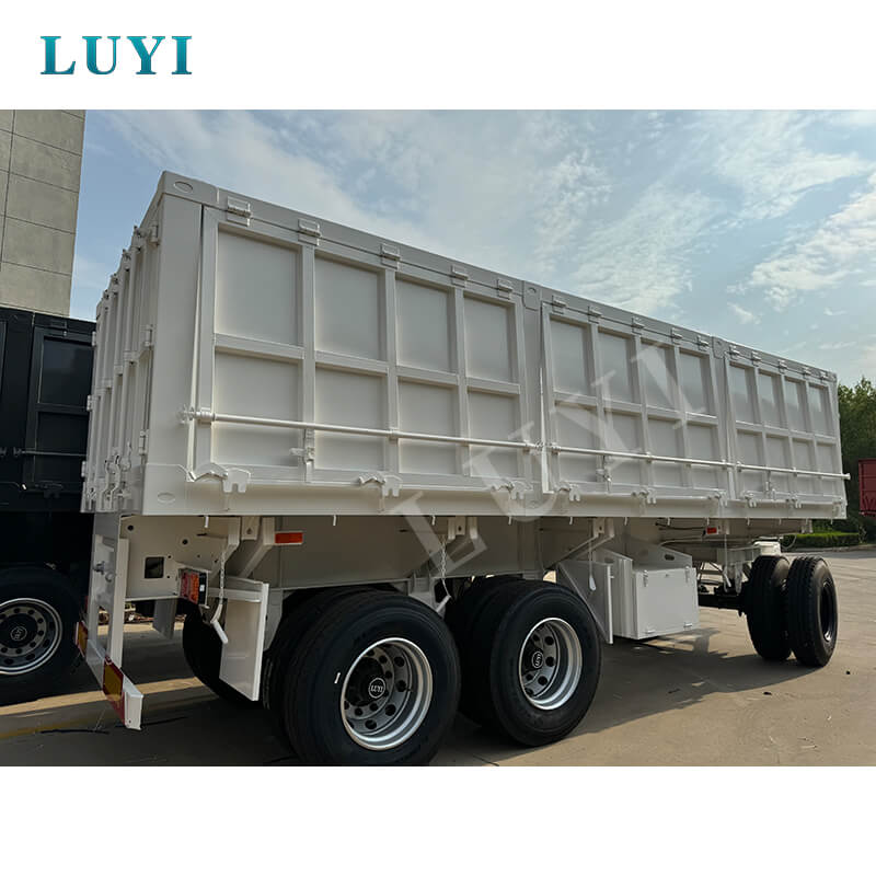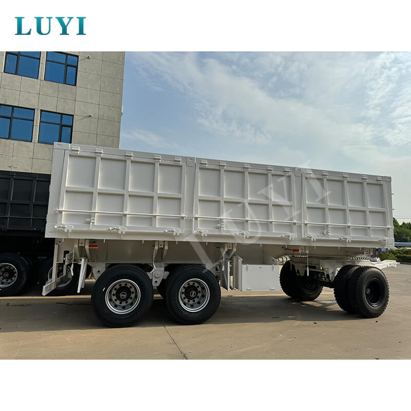 LUYI 3-akslet 40-tons lasttransporttraktor Side-Tip Dump Trailer, der stammer fra Shandong, Kina, er en lastbiltrailer med fuld trailer, specielt designet til sand- og grustransport. Trailerhuset er lavet af højstyrkestål, parret med valgfri 2-4 akselkonfigurationer og mekanisk/luftaffjedring. Den er tilpasset til 12R22.5 dæk, hvilket sikrer stabil bæreevne og stærk fremkommelighed, med en maksimal effektiv nyttelast på over 30.000 kg, der nemt opfylder kravene til tung belastning.