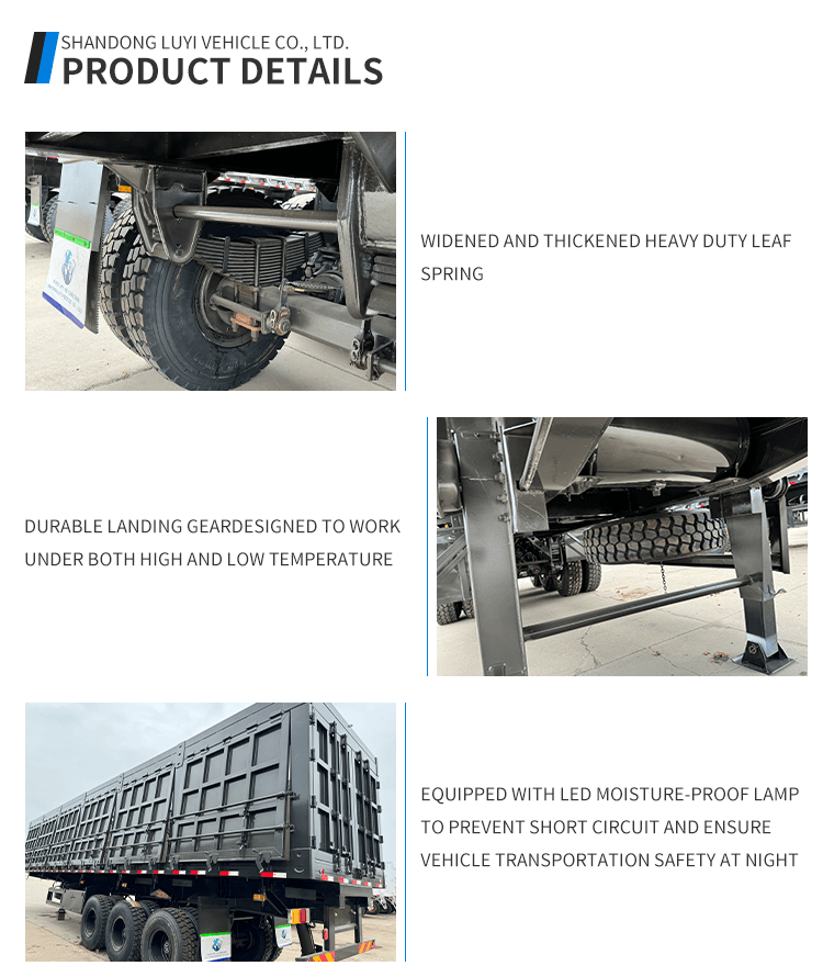 Med dimensioner på 11000x2500x3500mm og en maksimal nyttelast på 25001-30000kg opfylder den effektivt krav til tunge belastninger. Den er udstyret med mekanisk affjedring, 90(W)mm×13(Thickness)mm×10(Layer) bladfjedre og et dual-line bremsesystem for stabil og sikker drift. Standard 28 tons landingsstel og 2"(50mm)/3,5"(90mm) JOST-kongestift forbedrer tilpasningsevnen. Farve og logo kan tilpasses, hvilket gør det til et alsidigt og pålideligt valg til tunge transportbehov.