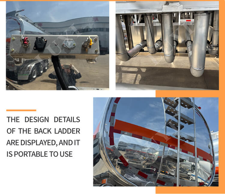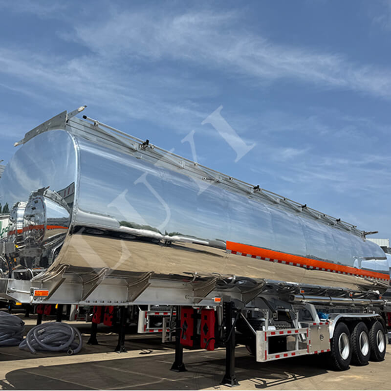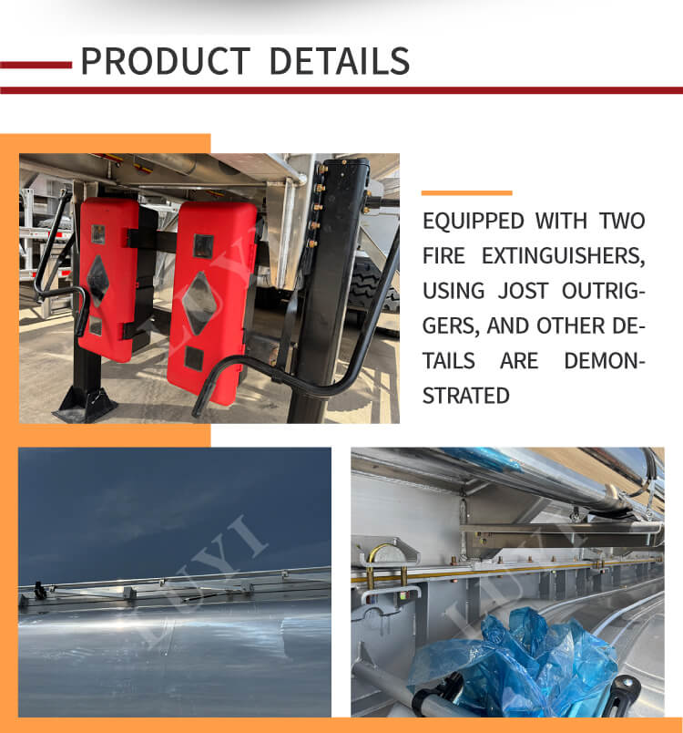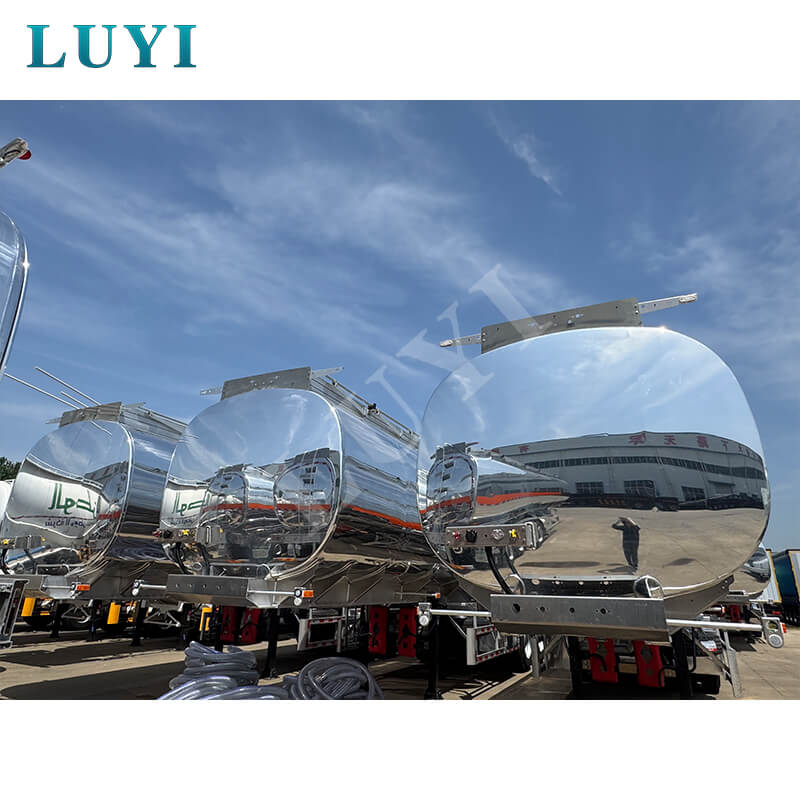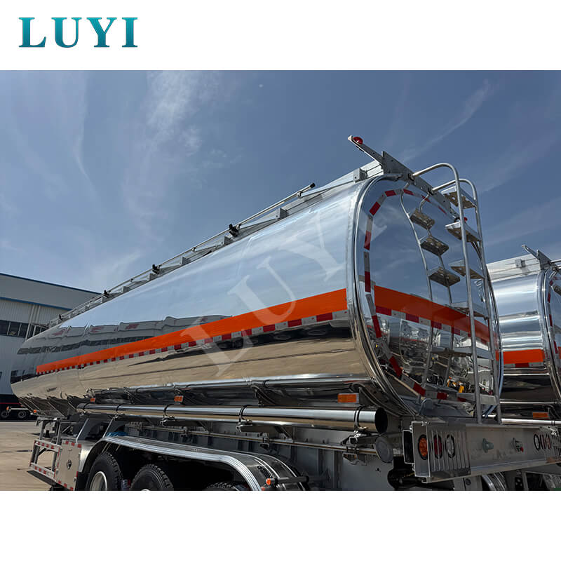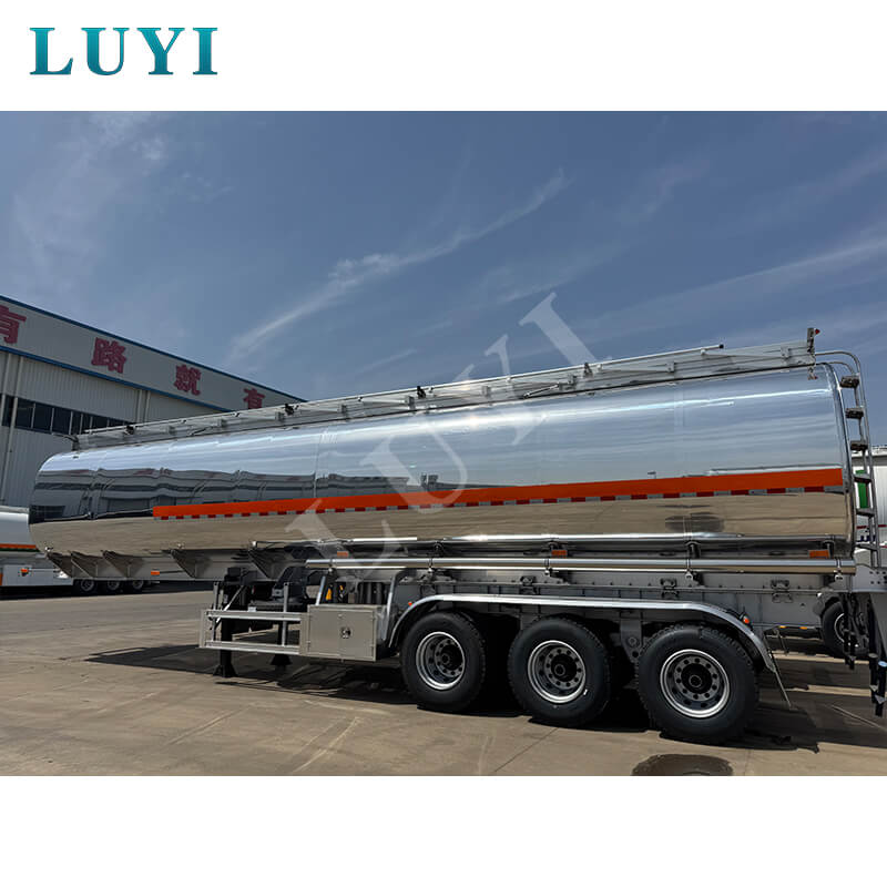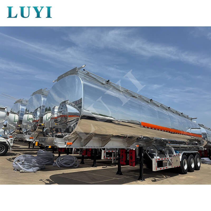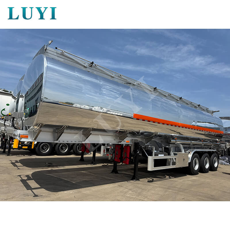 LUYI 3-akslet 45.000L 5-tank aluminiumslegering olietank Semi-trailer, der stammer fra Shandong-provinsen, Kina, er et højeffektivt og sikkert udstyr til olietransport. Den har dimensioner på 12.500×2.500×3.600 mm og en maksimal effektiv lastkapacitet på 60 tons, der er i stand til fleksibelt at transportere medier som diesel, benzin, petroleum og råolie.