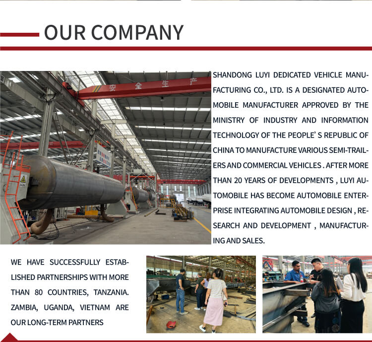 - Vores fabrik:Shandong Luyi Vehicle Co.,Ltd. er en af de kvalificerede producenter af forskellige trailere, såsom lowbed sættevogn, fladvogn, lasttrailer, skelet container semi trailer, 50ft flad trailer osv. Med høj standard maskiner og automatisk udstyr, kraftfuldt R&D team og elite salgsteam, har vi opbygget lange forretningsforbindelser med mange verdensberømte virksomheder såsom SINOTRUK, SHACMAN osv.