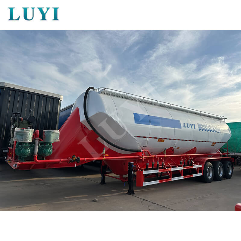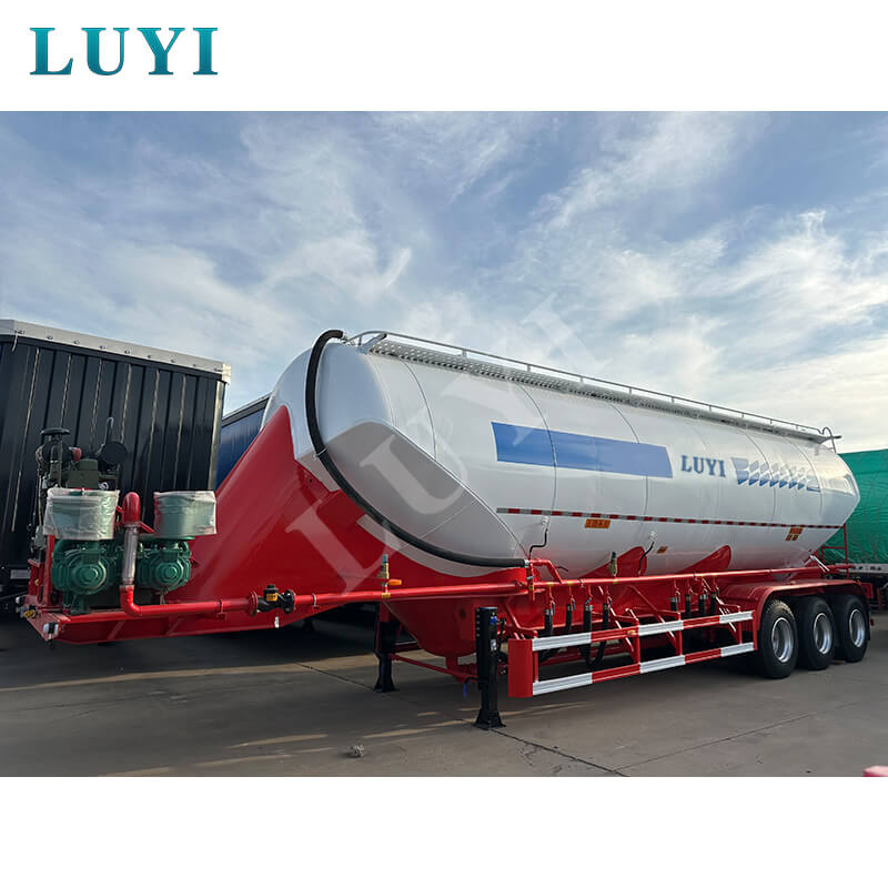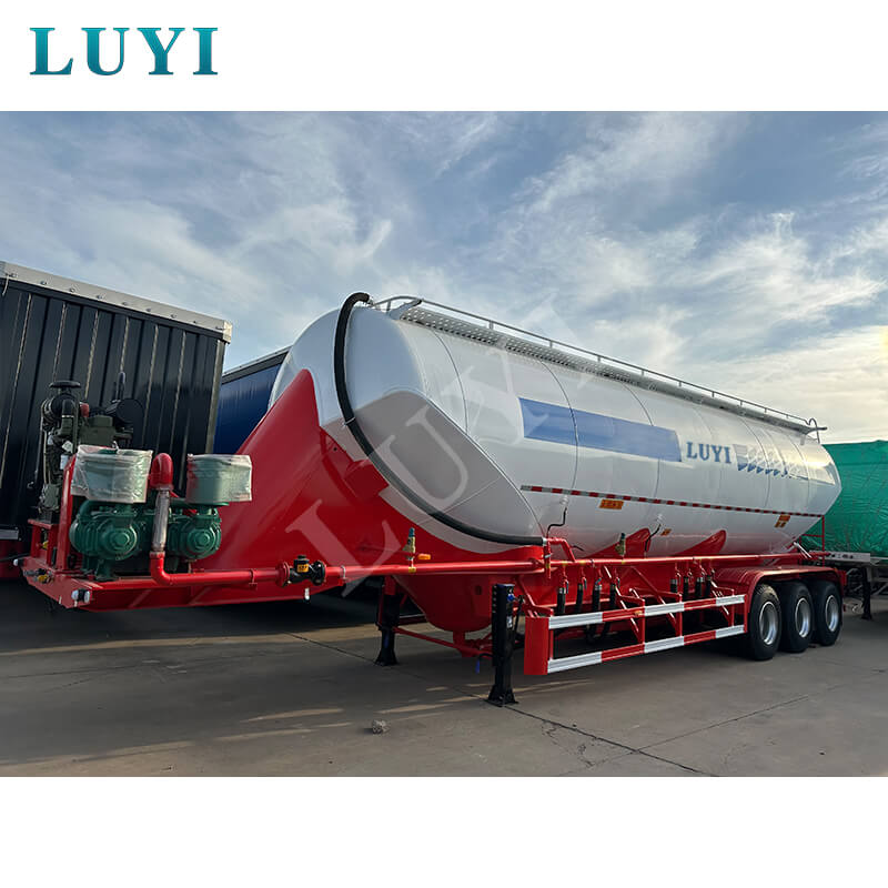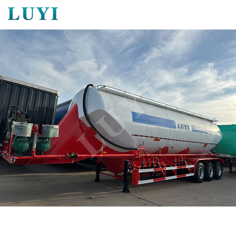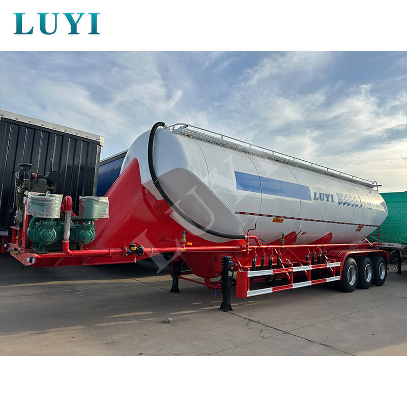 LUYI 3-akslet 50CBM Bulk V-Type Cement Tanker Semi-Trailer (også kaldet en pulvertankvogn), der stammer fra Shandong-provinsen, Kina, er en sættevogn, der er specielt designet til transport af bulkcementpulver. Den er velegnet til lastbil trailerscenarier og giver en effektiv løsning til byggematerialetransportområdet.
