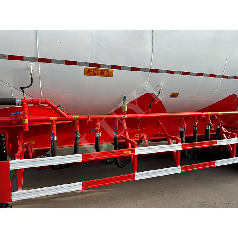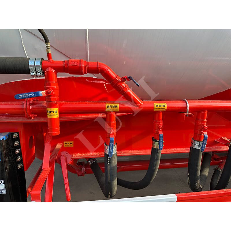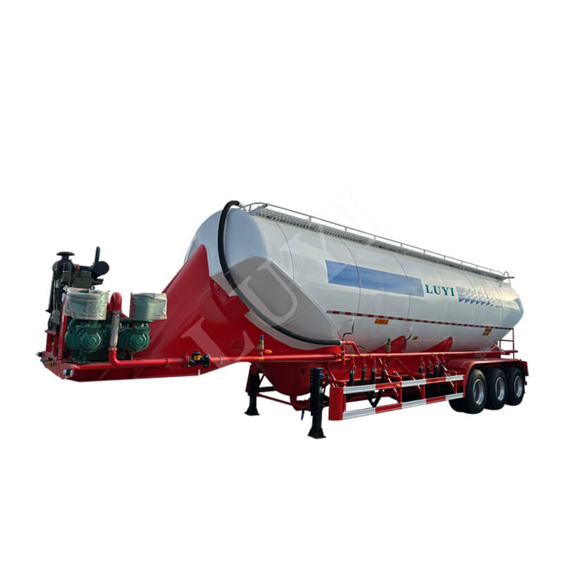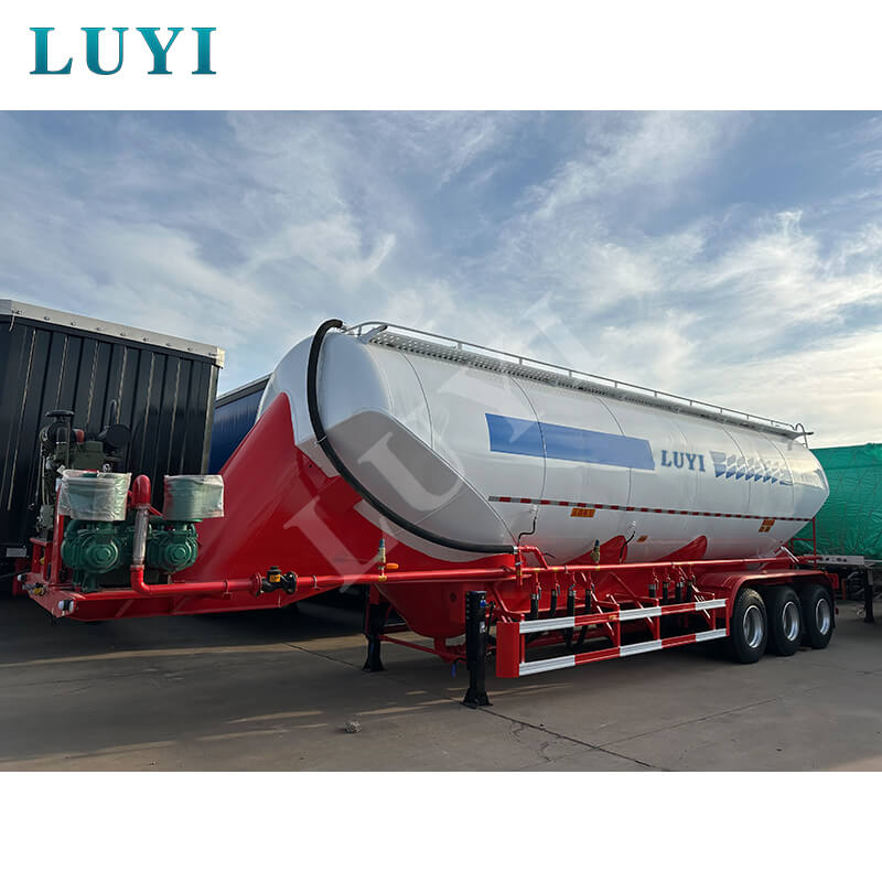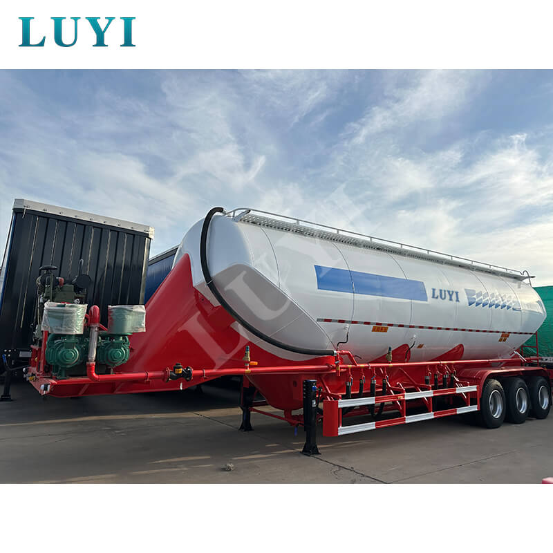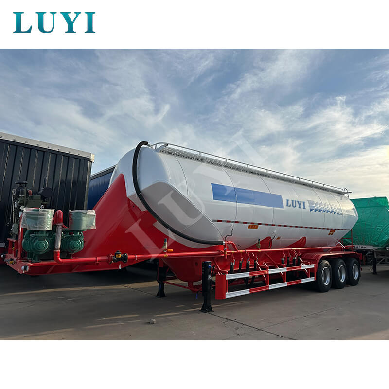 LUYI 3-akslet 50CBM Bulk V-Type Cement Tanker Semi-Trailer (også kaldet en pulvertankvogn), der stammer fra Shandong-provinsen, Kina, er en sættevogn, der er specielt designet til transport af bulkcementpulver. Den er velegnet til lastbil trailerscenarier og giver en effektiv løsning til byggematerialetransportområdet.