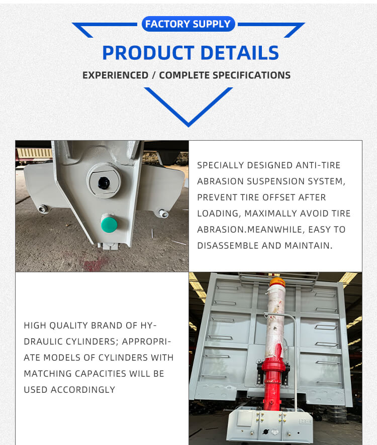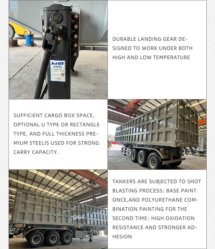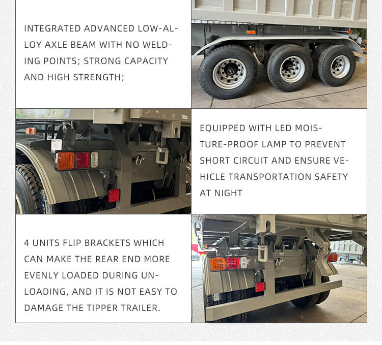 Den tilbyder fleksible konfigurationer, der passer til forskellige behov: Akselmuligheder omfatter 2/3/4 aksler fra pålidelige mærker BPW og FUWA, og affjedringsvalg af mekanisk eller luftaffjedring til stabil kørsel. Udstyret med 12R22.5-dæk, et standard 28-tons landingsstel og 2"(50mm)/3.5"(90mm) JOST-kongestifter, sikrer den stærk tilpasningsevne. Polyurethan-malingsprocessen øger holdbarheden, farven kan tilpasses, og den leveres med seks års garanti, hvilket gør den pålidelig til langtidstransport af sand og grus.