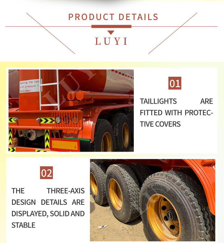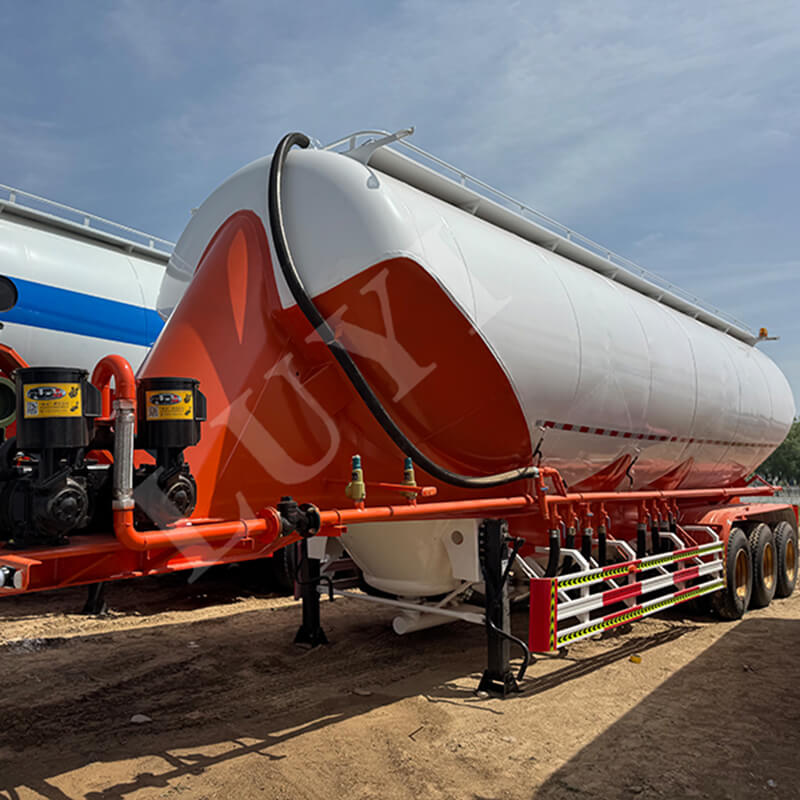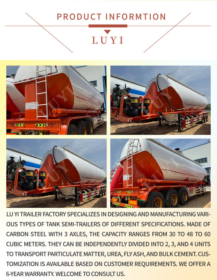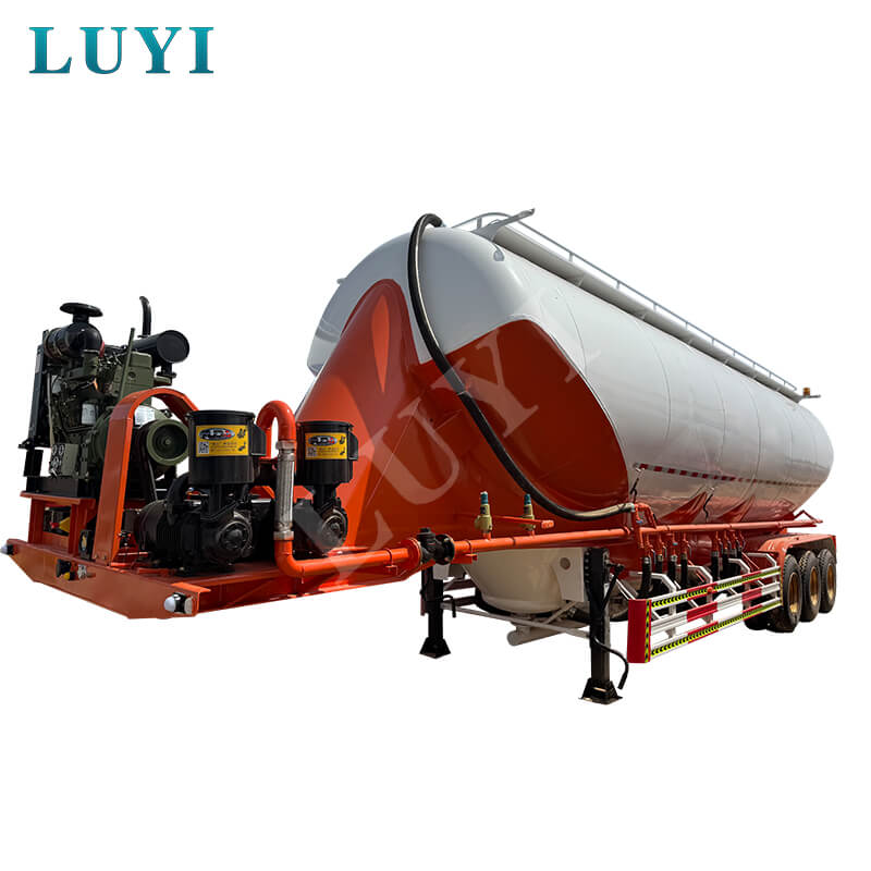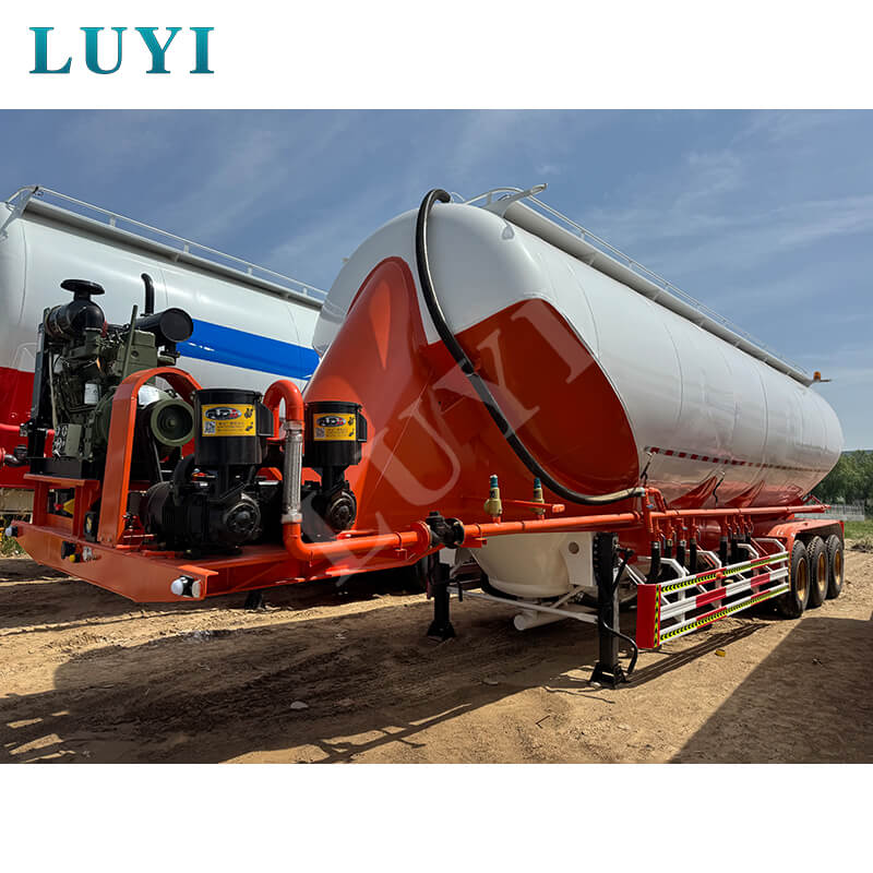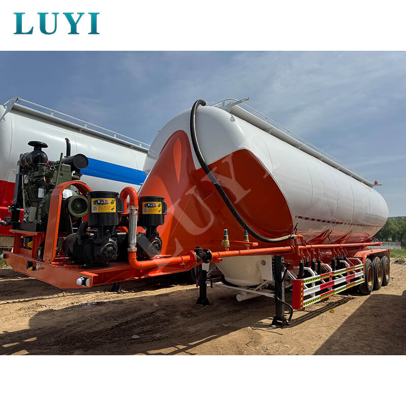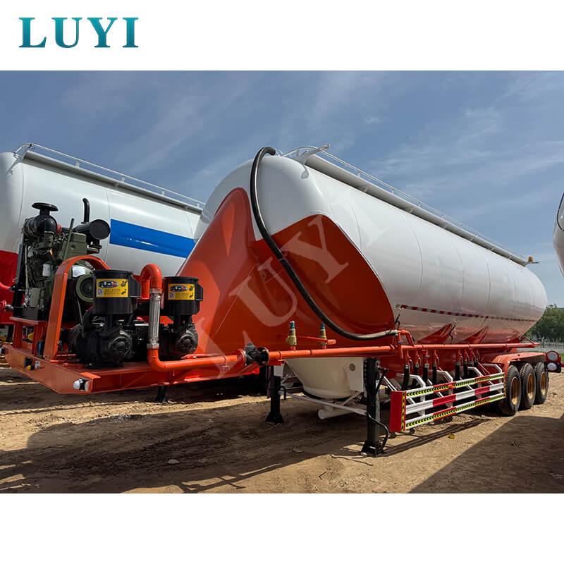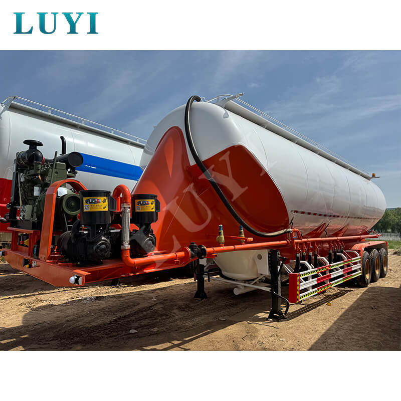 LUYI 3-akslet 50-tons V-Type Cement Tanker Semi-Trailer, der stammer fra Shandong-provinsen, Kina, er en højeffektiv lastbil-sættevogn, der er specielt designet til bulkcementpulvertransport, også kendt som en pulvertankvogn, som nøjagtigt opfylder behovene for lasttransportscenarier.