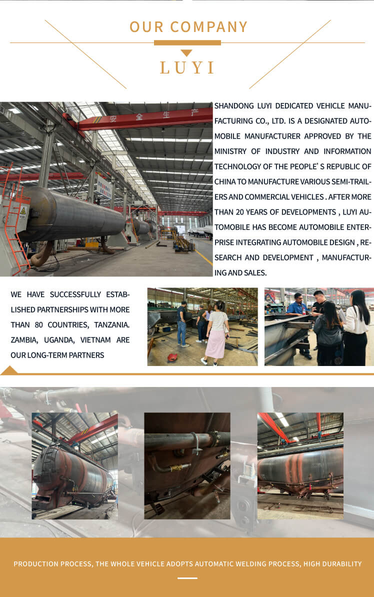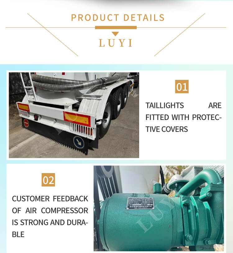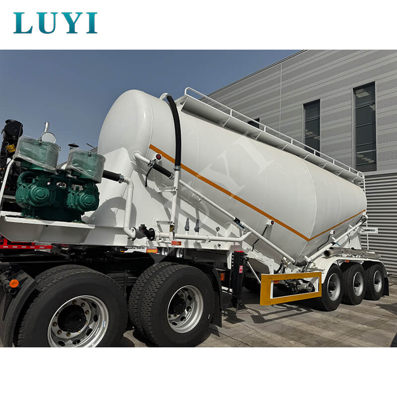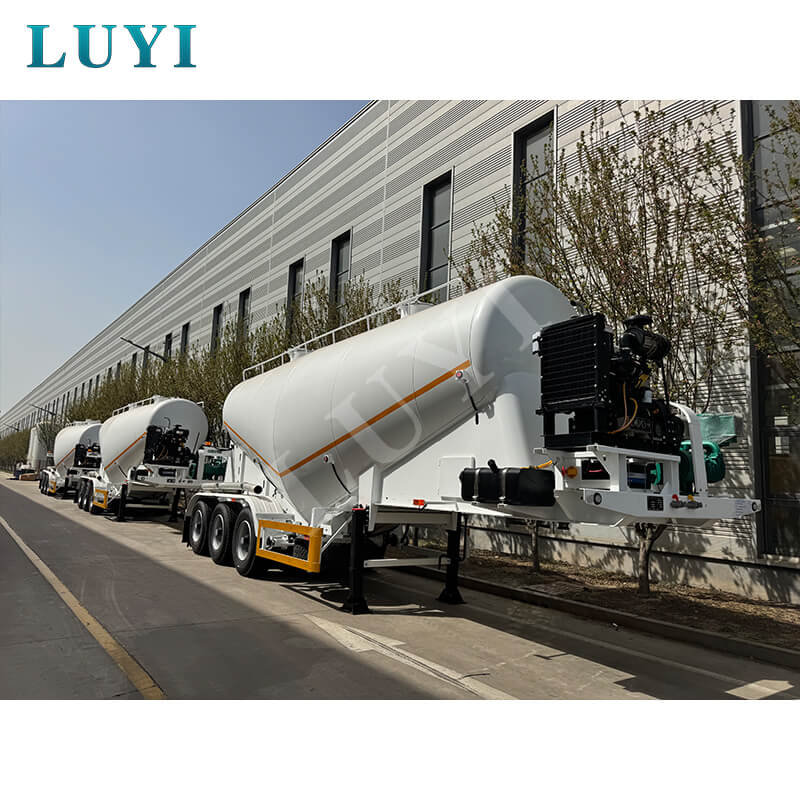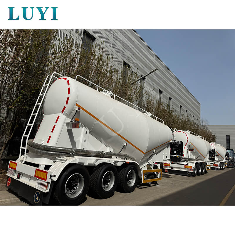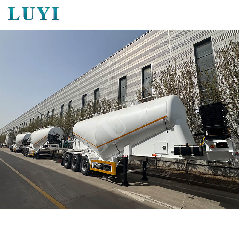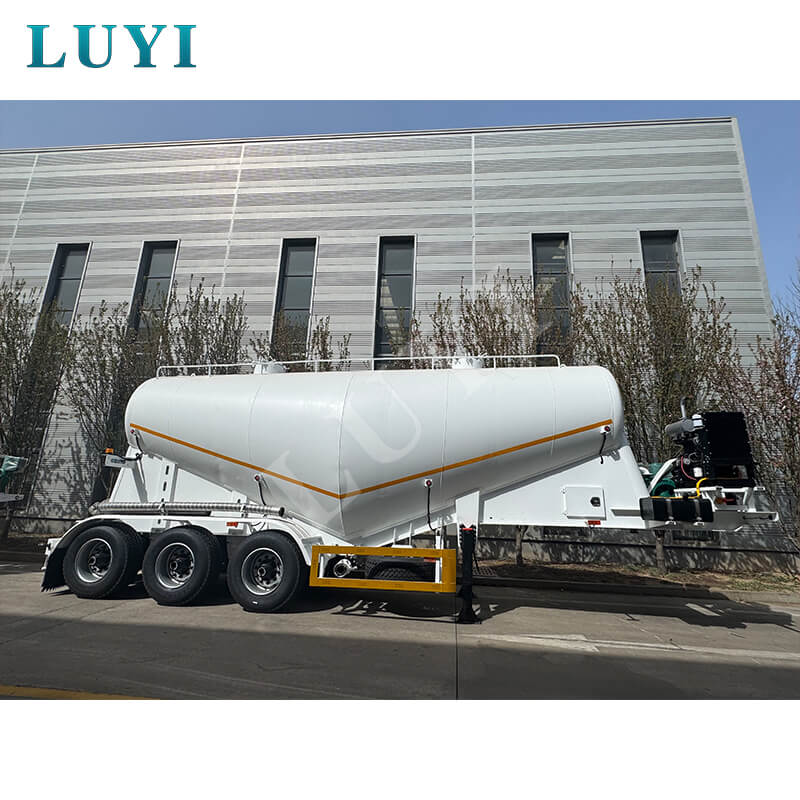 LUYI 3-akslet 30-60 kubikmeter cementtanker, også kendt som en pulvertankvogn, stammer fra Shandong-provinsen, Kina. Det er en højeffektiv sættevogn, der er specielt designet til at transportere bulk cementpulver, der nøjagtigt opfylder behovene i scenarier for lasttransport.