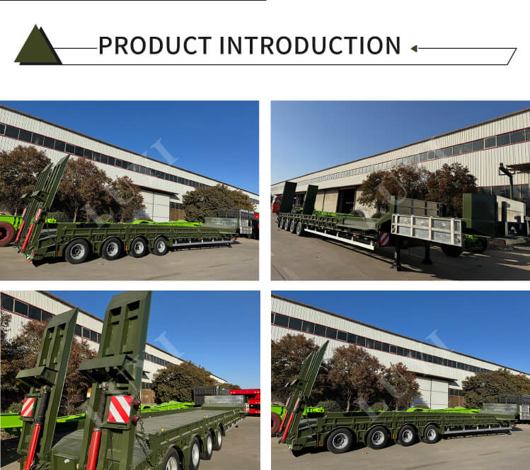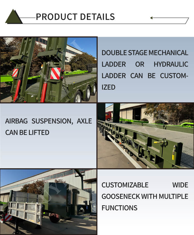 Udstyret med 4 FUWA 13-tons aksler og mekanisk affjedring, parret med 12R22.5 dæk, sikrer traileren stabil drift og stærk bæreevne. Den har standard 28-tons landingsstel og valgfri 90#/50# kongepinde til pålidelig forbindelse med traktorer. Farven kan tilpasses efter kundens behov og kombinerer praktisk og personliggørelse. Uanset om det er til transport af store maskiner eller tungt udstyr, er denne trailer et pålideligt valg med fremragende ydeevne og solid kvalitet.
