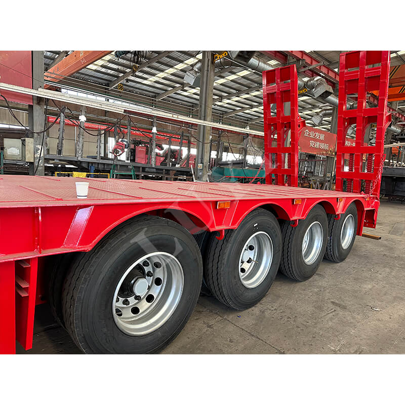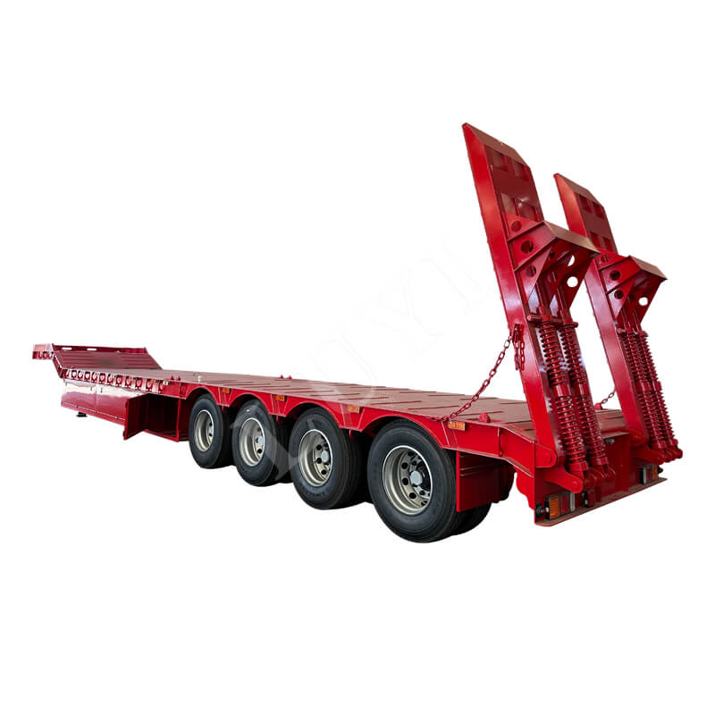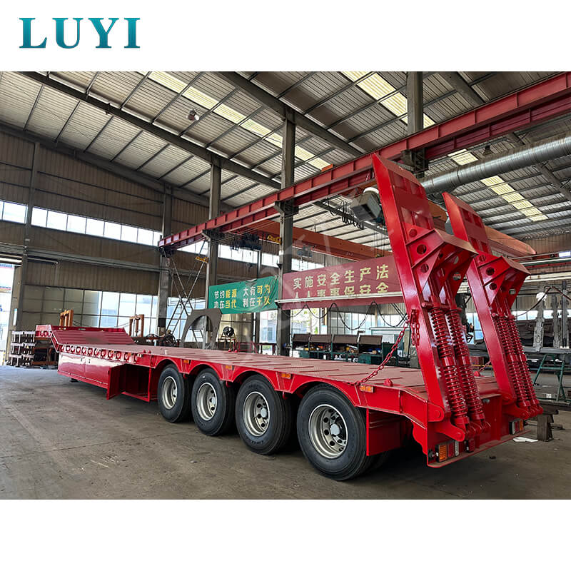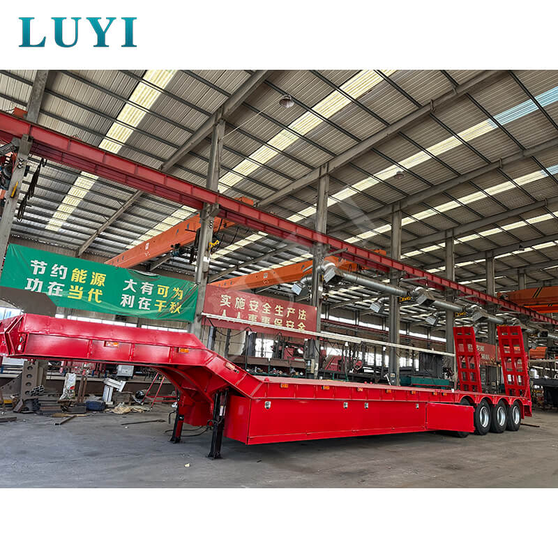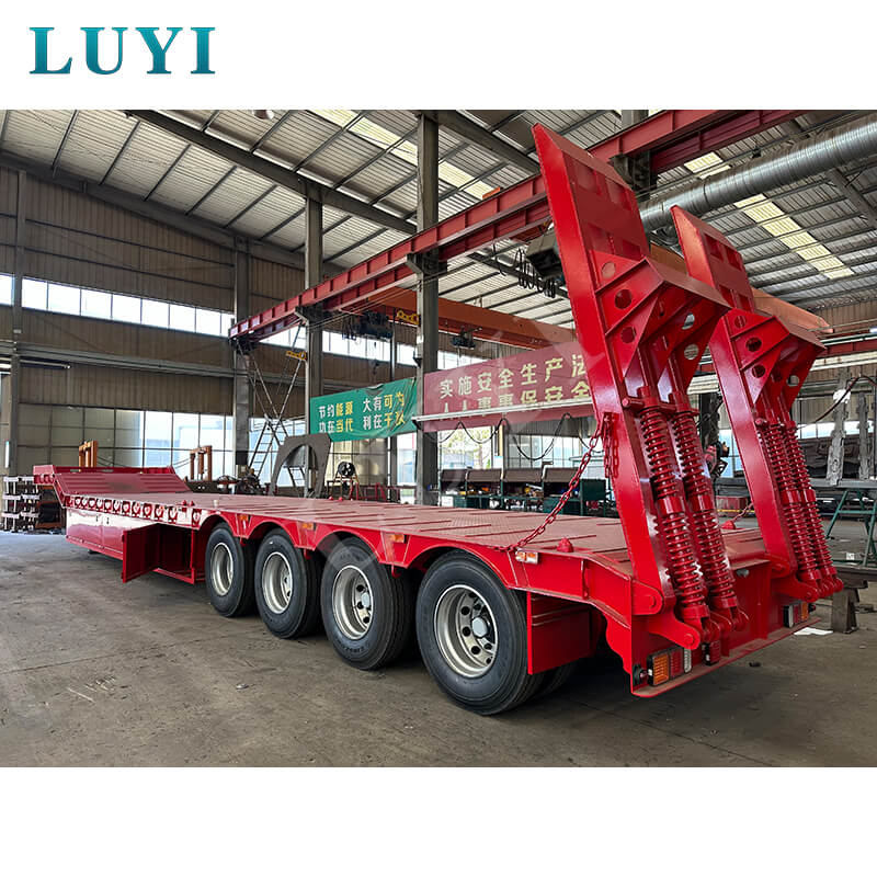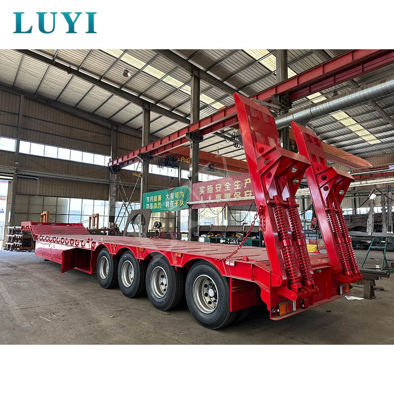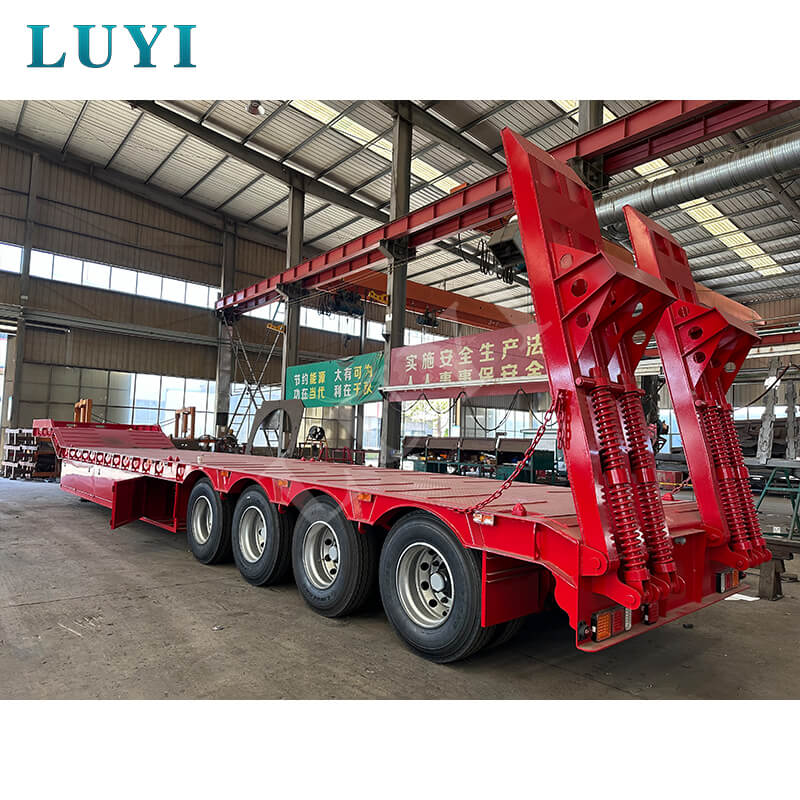 Luyi 4-akslet 60-tons Lowboy Semi-Trailer, der stammer fra Shandong-provinsen, Kina, er en højtydende lastbiltrailer specielt designet til transport af tungt udstyr, containergods og maskineri. Udstyret med en hydraulisk stige muliggør den bekvem og effektiv lastning og losning.