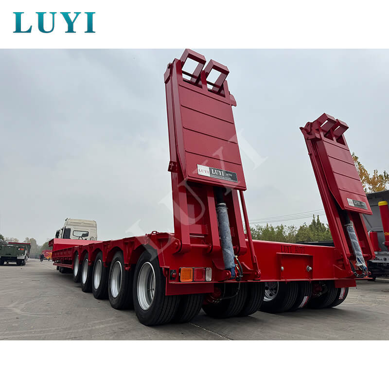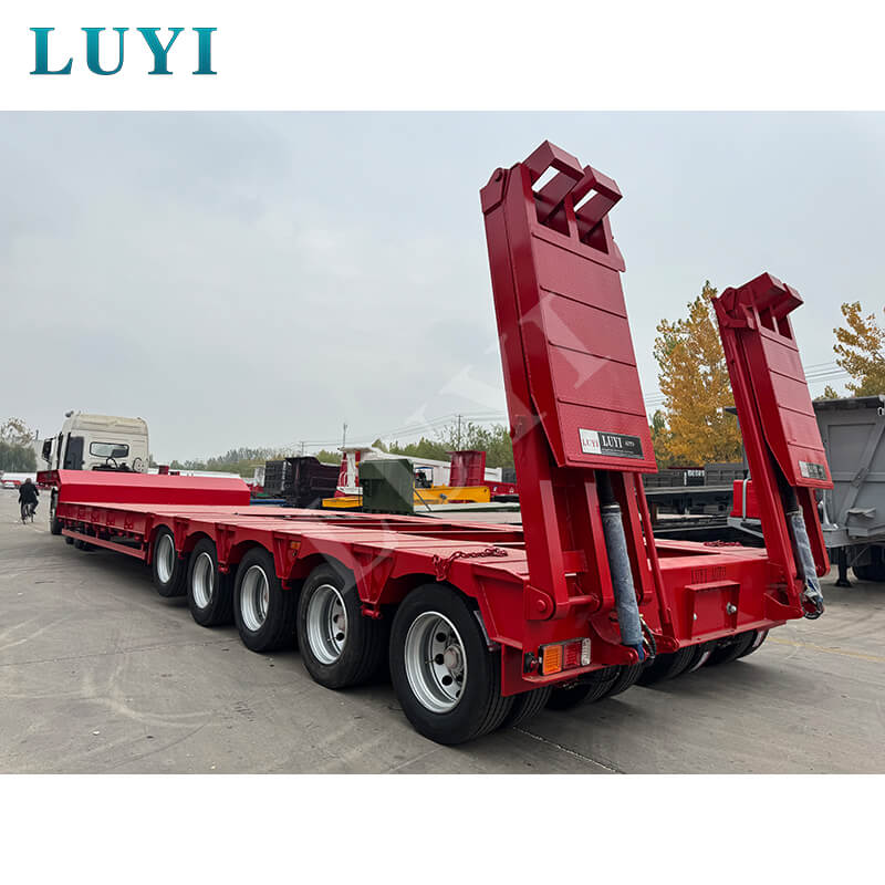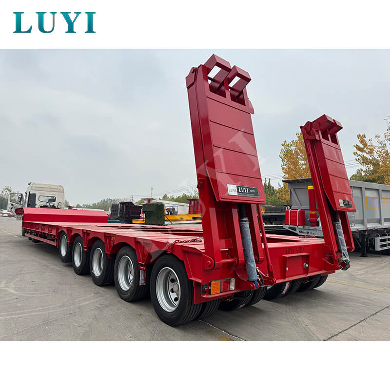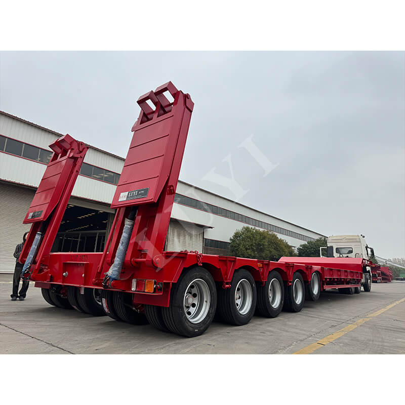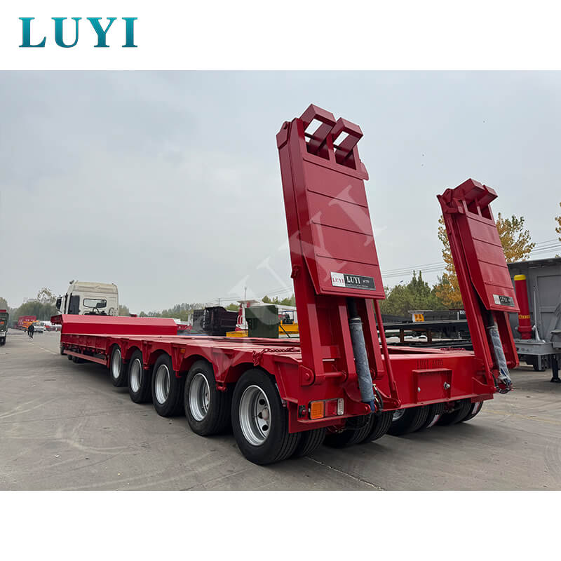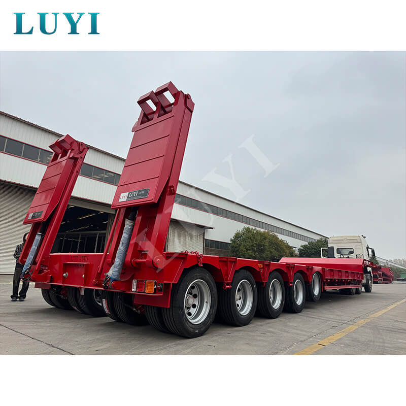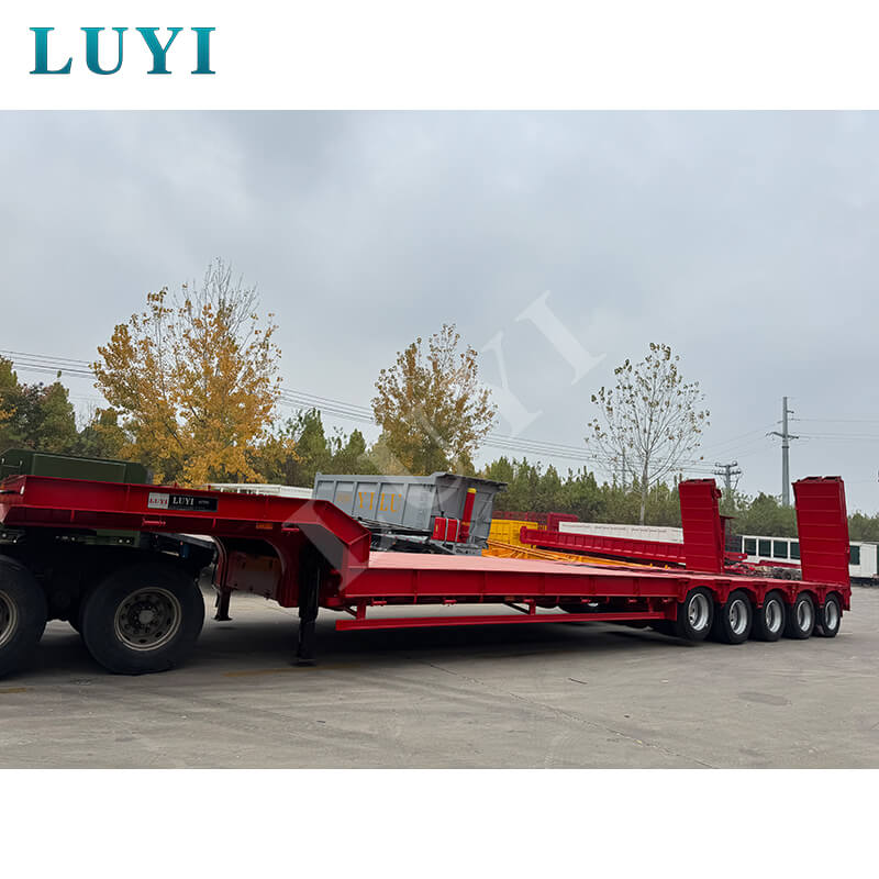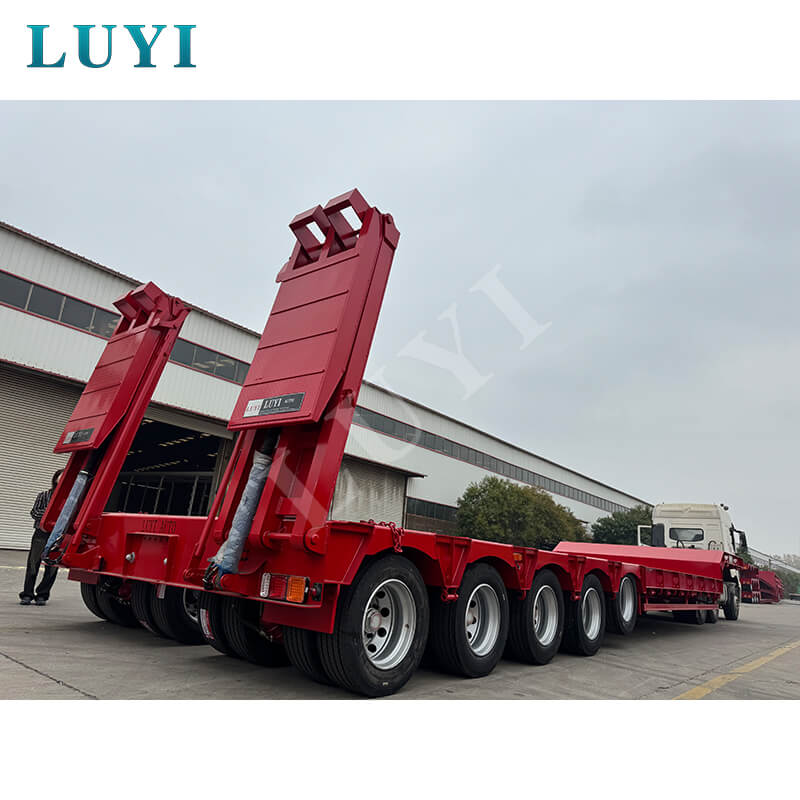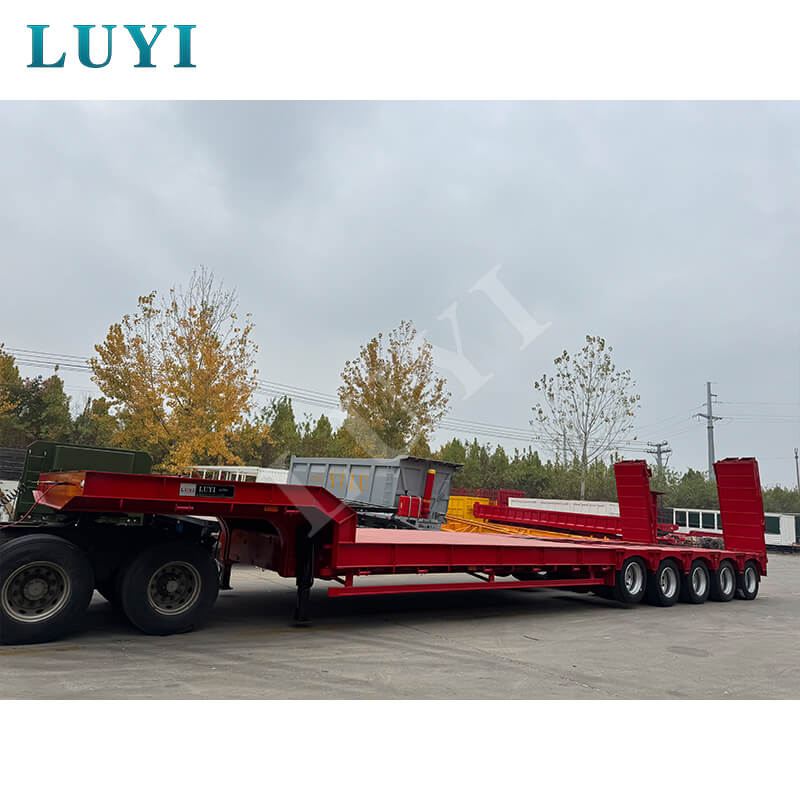 LUYI 5-akslet 180-tons 5-linje 10-akslet Lowboy-trailer, der oprindeligt blev produceret i Shandong-provinsen, Kina, er en helt ny sættevogn, der er specielt designet til lastbilanhængere. Den opfylder tunge transportbehov med sin høje bæreevne og stærke stabilitet.