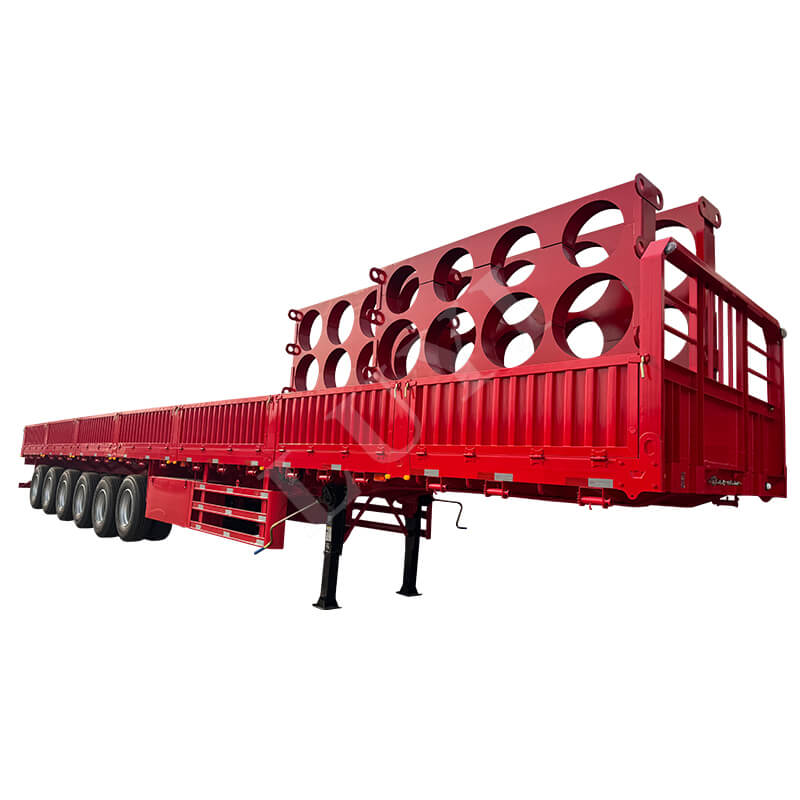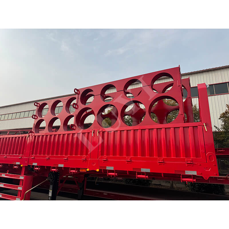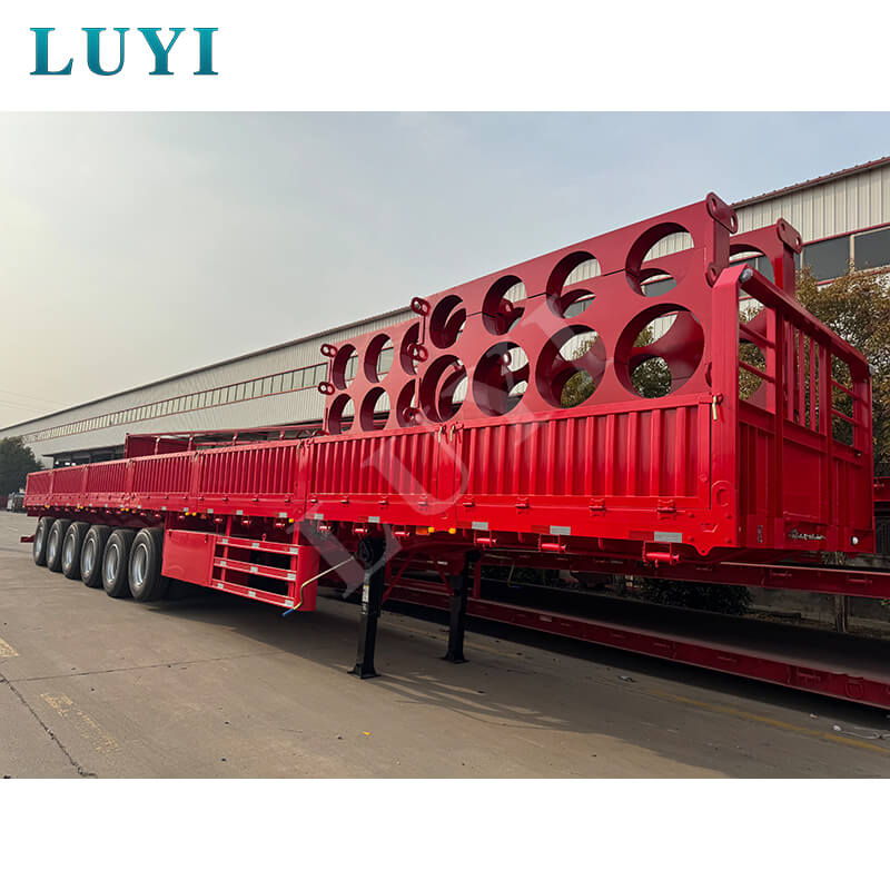 LUYI 6-akslet 15,5m 80-100 Ton 40ft Side Wall Semi-Trailer, også kaldet en stake-type/fladbed sættevogn, stammer fra Shandong, Kina. Det er en højkvalitets sættevogn designet til transport af containere og bulklast. Fremstillet udelukkende af stål, måler den 15500x2500x1600 mm og har en maksimal effektiv nyttelast på 60-100 tons, der kan prale af en stærk lastbærende kapacitet til nemt at imødekomme behov for tung last.
