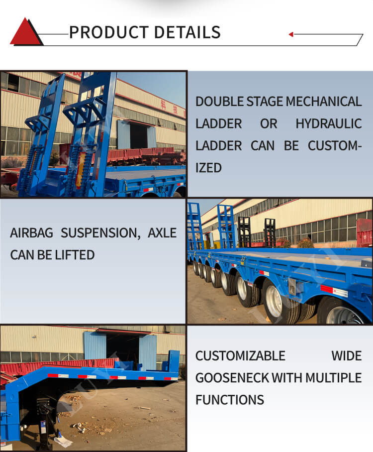 Med hensyn til konfigurationen anvender den et dual-line bremsesystem for at sikre køresikkerhed, standard 28 tons støtteben for stabil støtte og JOST kingpins tilgængelig i 2-tommer (50 mm) eller 3,5 tommer (90 mm) muligheder. Farver kan tilpasses af kunderne, hvilket giver en effektiv og pålidelig løsning til ultra-tung transport.