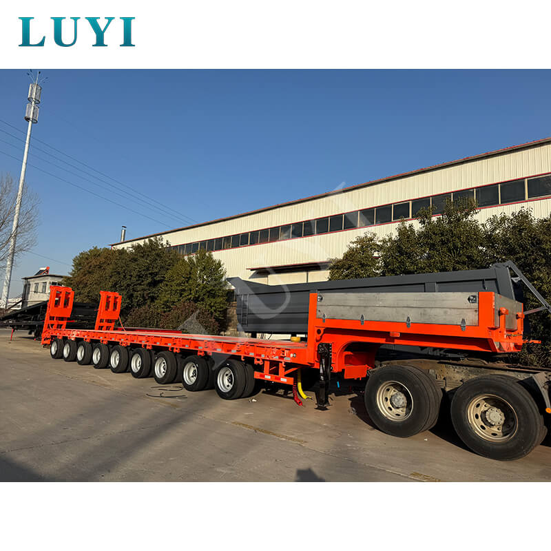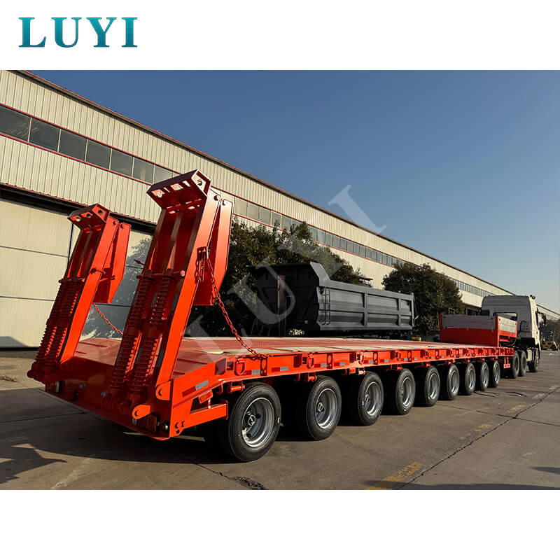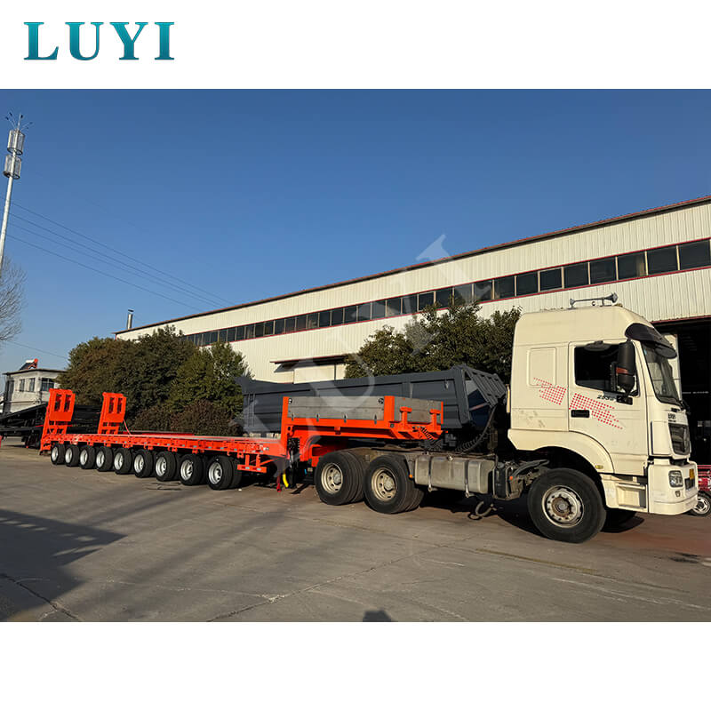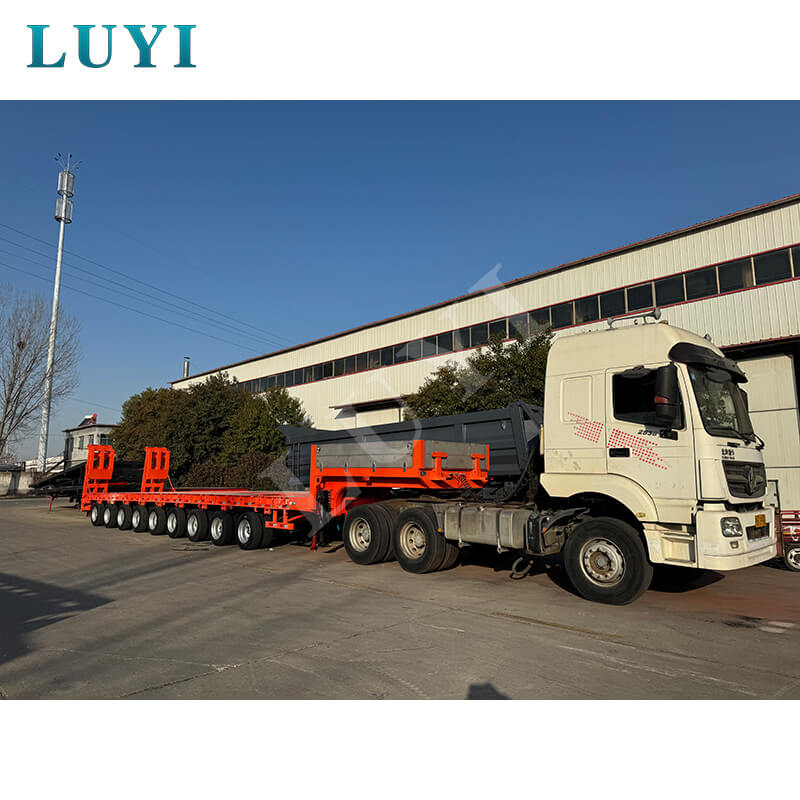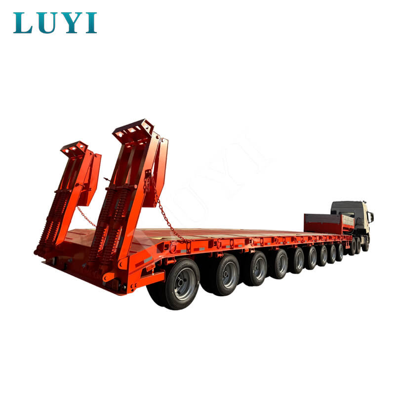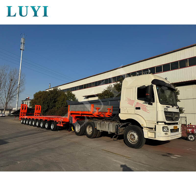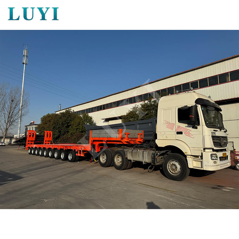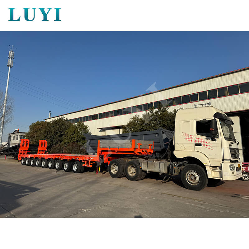 Luyi 9-Axle 100-Ton Gooseneck Lowboy Semi-Trailer, der stammer fra Shandong, Kina, er et højkvalitets sættevognsudstyr designet specielt til transport af tung last. Kompatibel med lastbiltræk, den måler 17x2,55x1,5m. Udstyret med en 9-akslet konfiguration og valgfri mekanisk eller luftaffjedring, spænder dens lastkapacitet fra 60 til 120 tons, med en maksimal lastkapacitet på 100 tons, hvilket giver robust lejeydelse.