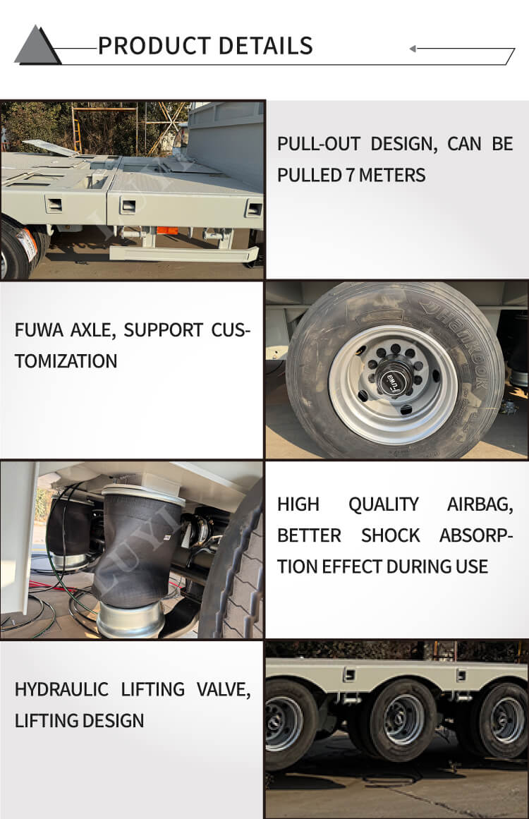 Traileren er udstyret med 8 Fuwa- eller BPW-aksler og understøtter mekaniske eller luftaffjedrede muligheder for stabil drift. Det matcher 12R22.5/12.00R20/11R22.5 dæk og er udstyret med standard 28-tons landingsstel og 2-tommer (50 mm) eller 3,5-tommer (90 mm) JOST-kongestifter til sikker forbindelse. Med tilpassede farver og solid struktur kombinerer den fleksibilitet, holdbarhed og sikkerhed, hvilket gør den til et ideelt valg til transport af tungt udstyr.