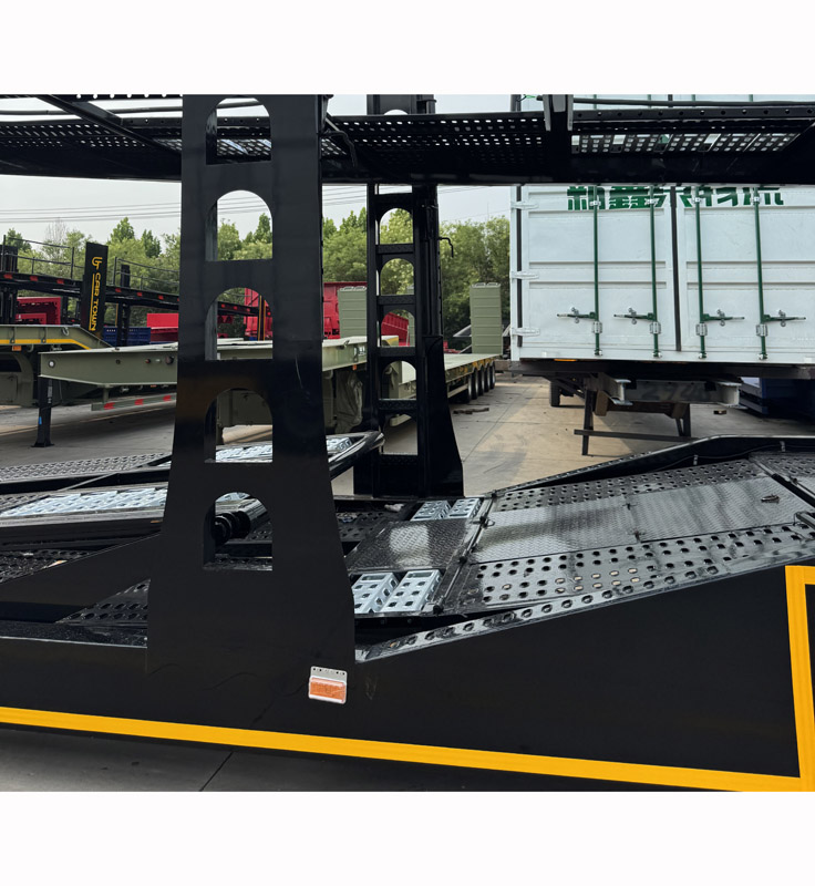Sikkert køretøjsfastgørelsessystem: Hver hjulposition er udstyret med professionelle, justerbare hjulklodser og højstyrke surringsstropper, der sikrer, at hvert køretøj er sikkert fastgjort og forbliver stationært under transport.