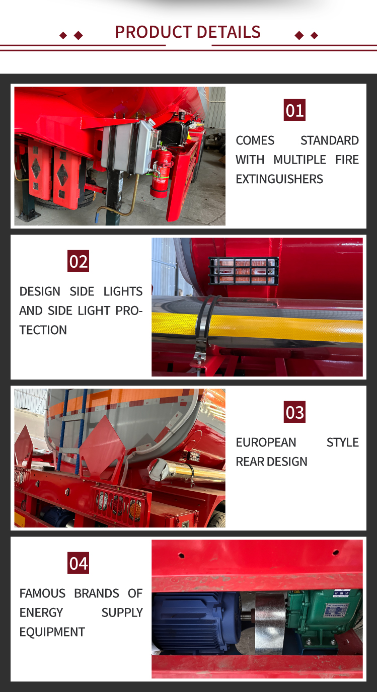 Tilbyder omfattende tilpasning og understøtter strukturelle justeringer (design med flere rum, justerbare olieindtag/-udløb), materialeopgraderinger (Q235 kulstofstål, rustfrit stål til korrosionsbestandighed, aluminiumslegering til letvægt) og funktionelle tilføjelser (bølgebaffler, temperaturkontrol, intelligente niveaumålere). Som sættevogn kan den kombineres med traktorer for høj fleksibilitet (separat parkering for vedligeholdelse) og streng overholdelse af nationale regler, herunder tryke-test og lækageforebyggelse, der sikrer sikker og effektiv olietransport.
