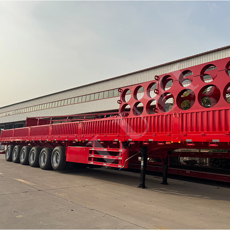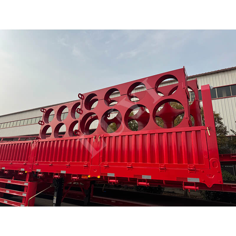 LUYI 6-akslet 15,5m 80-100 Ton 40ft Side Wall Semi-Trailer, også kaldet en stake-type/fladbed sættevogn, stammer fra Shandong, Kina. Det er en højkvalitets sættevogn designet til transport af containere og bulklast. Fremstillet udelukkende af stål, måler den 15500x2500x1600 mm og har en maksimal effektiv nyttelast på 60-100 tons, der kan prale af en stærk lastbærende kapacitet til nemt at imødekomme behov for tung last.