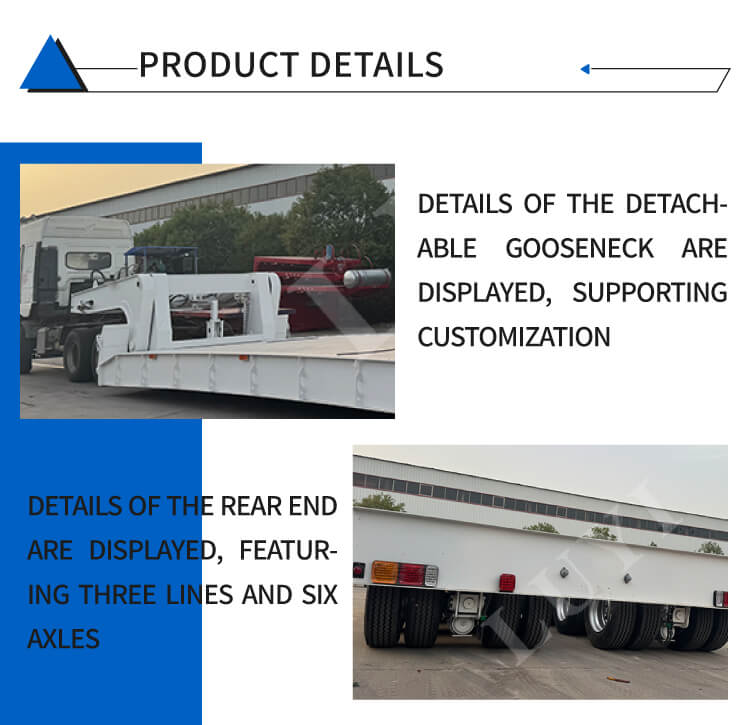 Med hensyn til detaljer er den udstyret med standard 28-tons landingsstel og giver JOST kongepinde i to muligheder: 2" (50 mm) eller 3,5" (90 mm) for at tilpasse sig forskellige traktorer. Kropsfarven kan tilpasses af kunderne, og det sammenfoldelige svanehalsdesign øger transportfleksibiliteten yderligere. Det er et ideelt valg til overførsel af tungt udstyr inden for teknik, minedrift og andre områder.